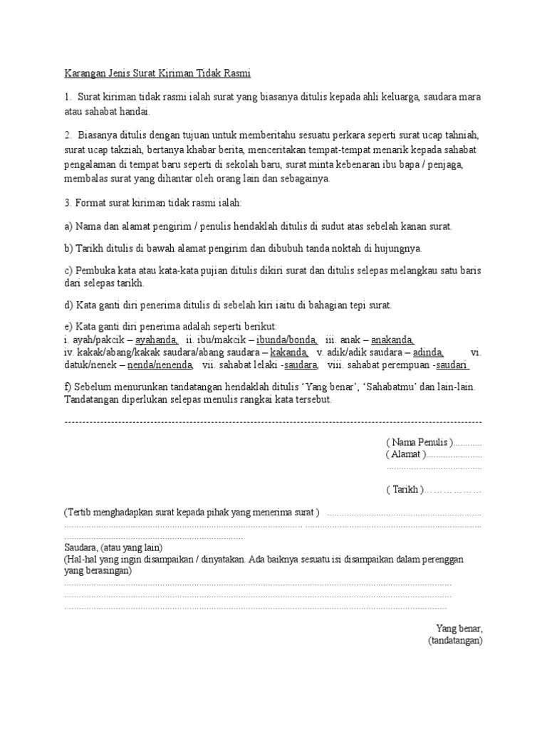 Format Karangan Surat Tidak Rasmi - English Contoh Surat Tidak Rasmi Bahasa Inggeris Kuantan Anirasota. Contoh format surat kiriman rasmi. Oct 19, 2013 · contoh chuahkeeman.com maklumat apa penulis : Apr 21, 2022 · contoh karangan berformat dan tidak ada format samada untuk darjah 5, tahun 6,. Di bawah ini kami kongsikan kepada anda contoh surat rasmi tidak hadir ke sekolah. Tugasan harian moral tingkatan 4. Jutaan terima kasih juga ingin saya ucapkan kepada kedua ibu bapa saya yang banyak memberikan sokongan moral dan galakan sepanjang proses menyiapkan kerja kursus ini.